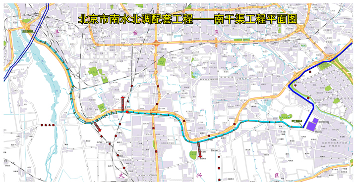 南干渠工程位于北京南部丰台、大兴地区,起点为南水北调中线干线北京段永定河倒虹吸末端,终点为亦庄调节池,是直接联系南水北调总干渠到规划郭公庄、黄村、亦庄等水厂的输水管线。作为北京市南水北调配套工程,其承担着北京城市东部、南部地区的供水任务。