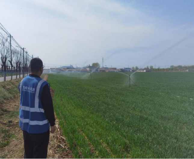 大地刚从冬眠中苏醒,泥土还带着几分寒意,春灌的水流便沿着管道汩汩流淌,喷洒在广袤的田地里。水滴漫过干渴的麦田,枯黄的叶尖渐渐挺直,泛出新绿。整个冬天没有被雪水滋润的小麦,让2025年的春灌来得要早一些。